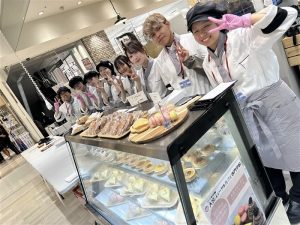 当日は、1年生と2年生の学生が協力し、朝から約300個の生菓子・焼菓子を製造。店舗運営の一連の流れを学生自身で担い、接客も主体的に行いました。